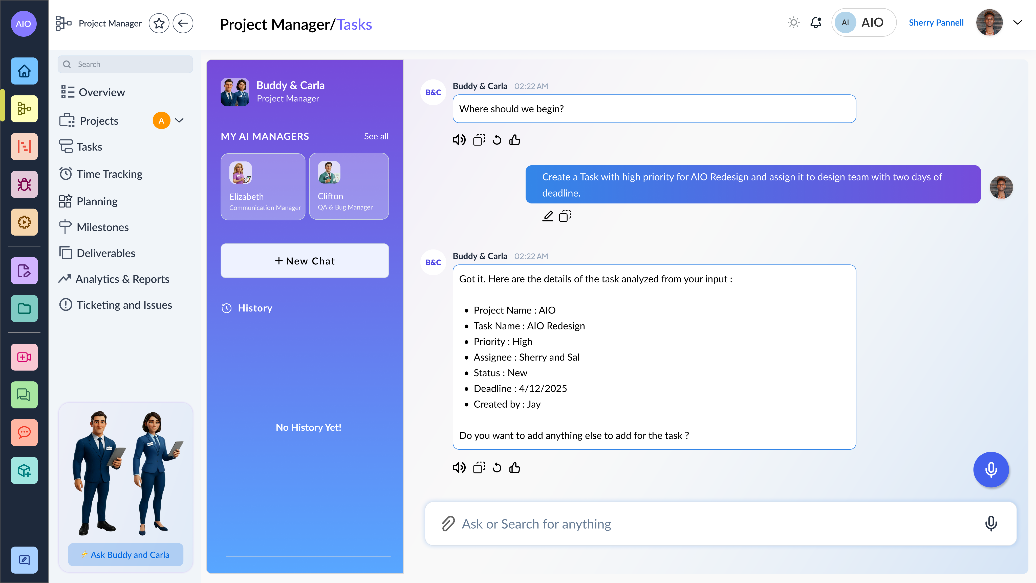 Create projects instantly from natural language — scope, timelines, and ownership auto-defined.